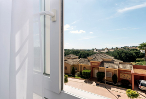 De woonkamer geeft toegang tot het ruime hoofdterras, waar comfortabele stoelen en een bank uitnodigen om buiten te ontspannen. Vanaf hier geniet u van een open uitzicht over de omgeving en het Andalusische landschap, met de Costa de la Luz in de verte.